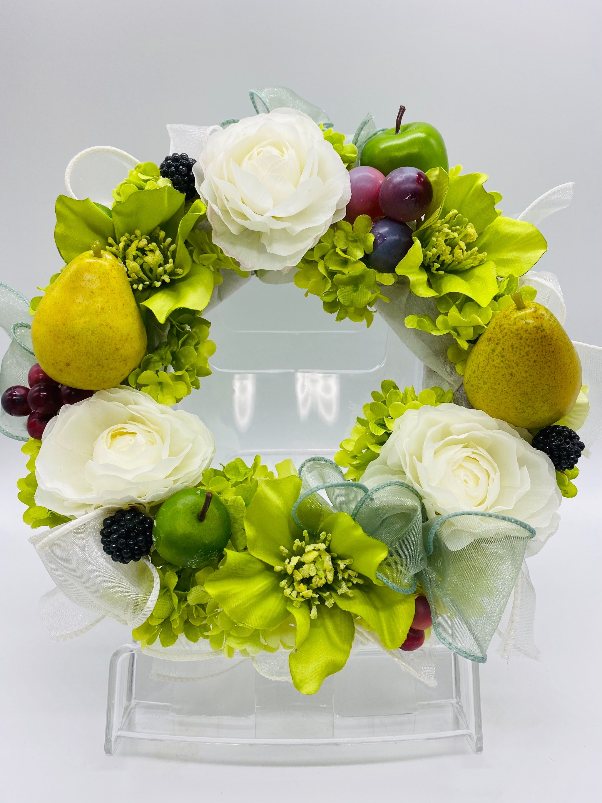 毎回アートコ横丁を華やかに飾ってくれるシャロンママさんの作品から、たくさんのフルーツが盛り込まれたビタミンカラーのリースは春先から夏にかけてオススメです!