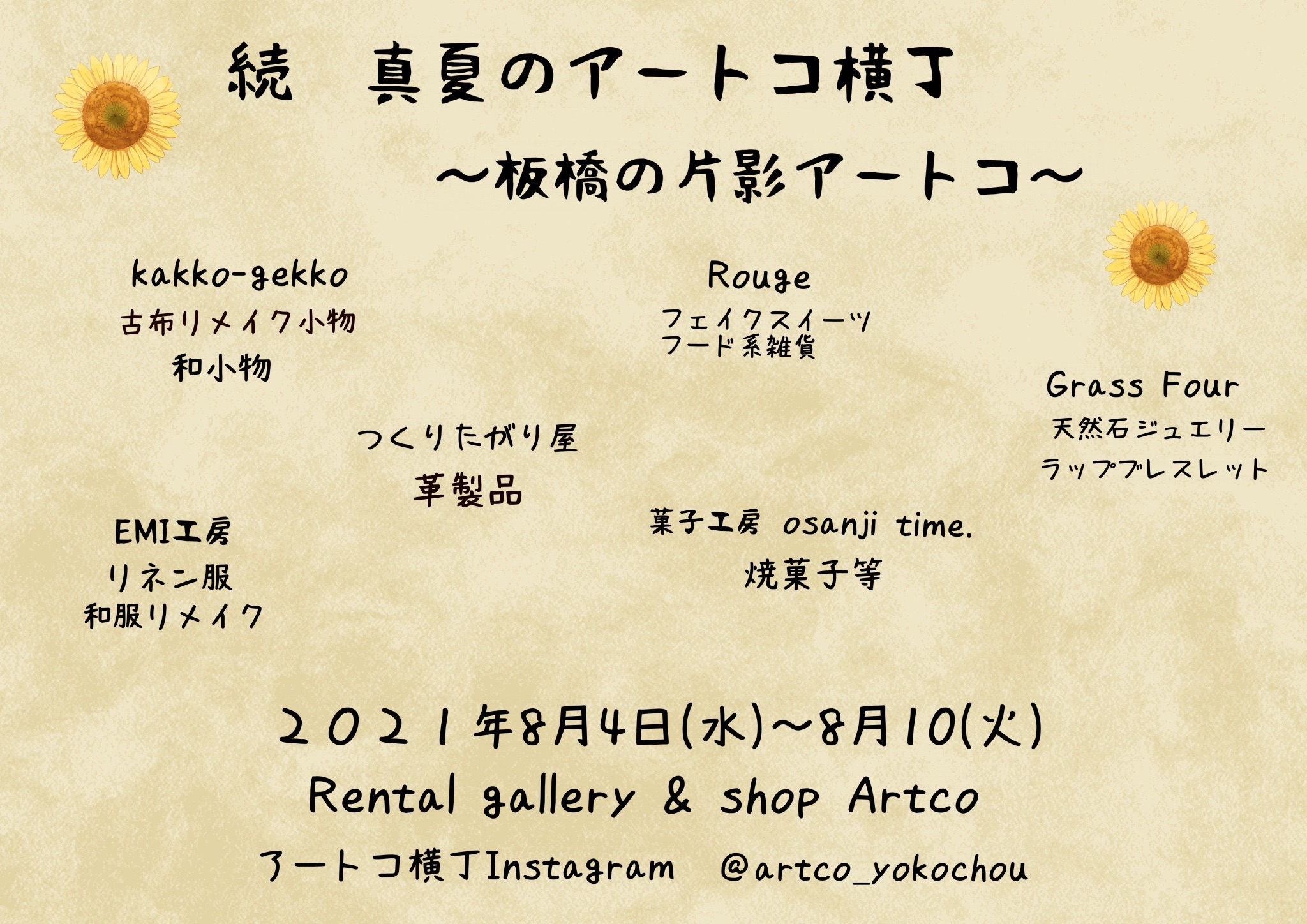 緊急事態中プラスオリンピック開催中のイベントですが、アートコでのんびりお店番していますのでお時間がある方は是非♪