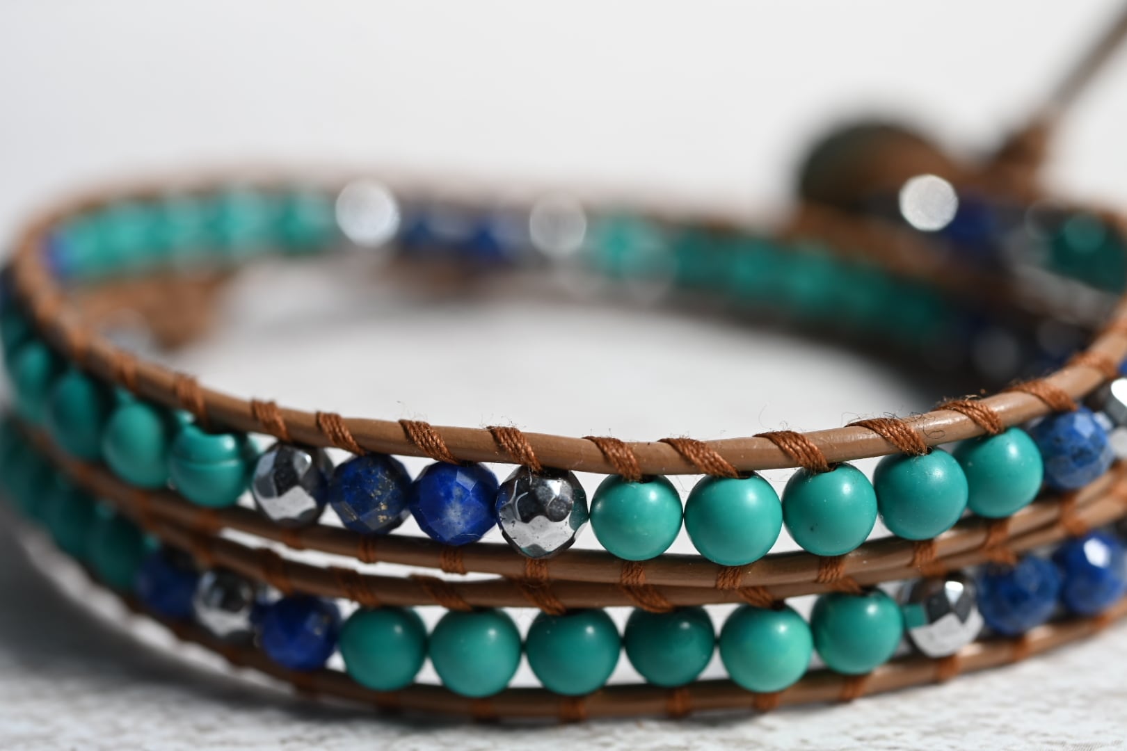 二つの異なる青が重なり合い、調和の美しさを奏でる2連ラップブレスレットです。