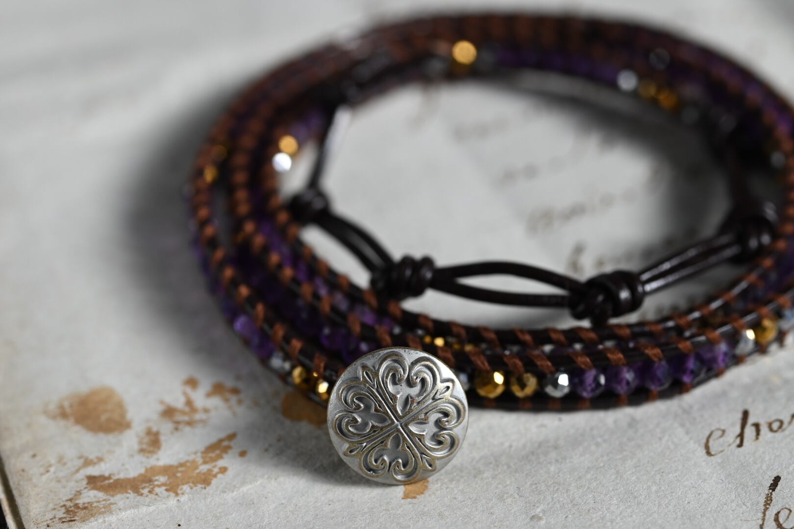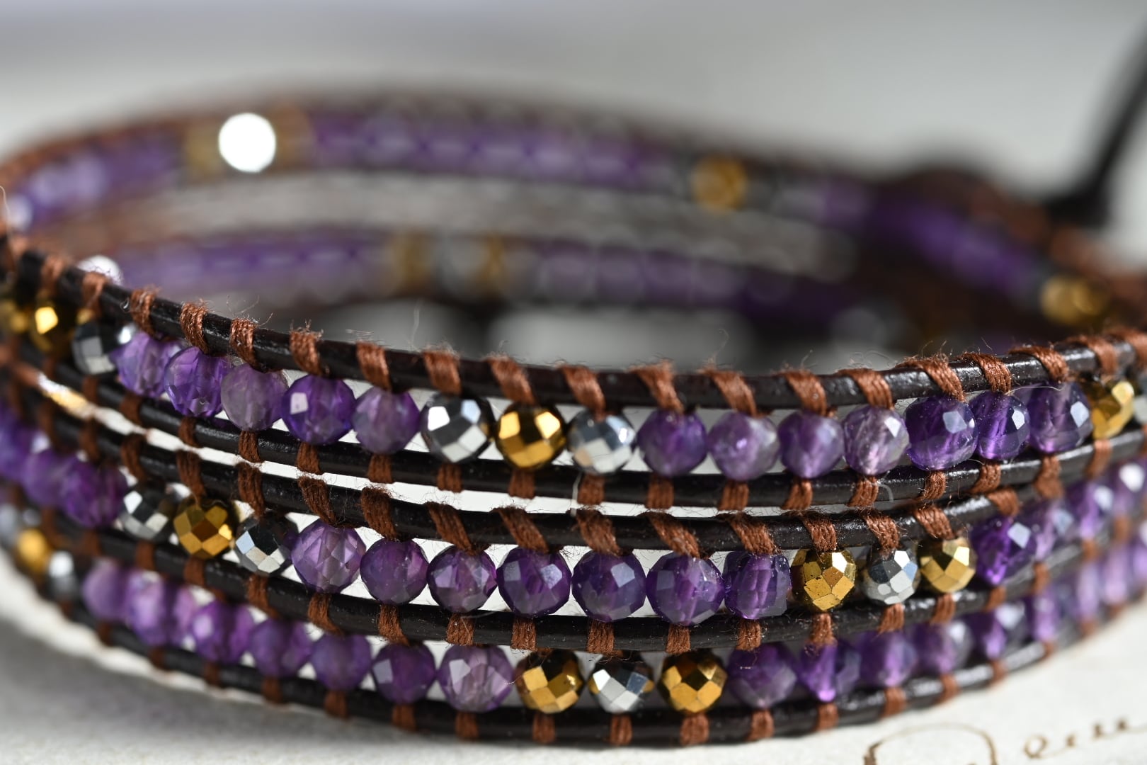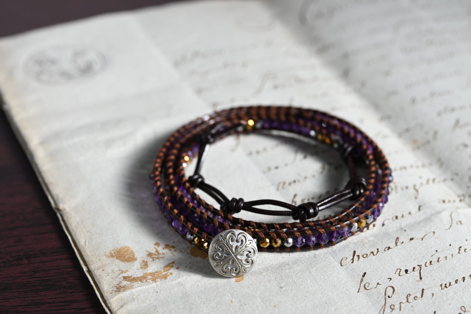 透明感あふれるアメジストを贅沢に繋げた、3連仕立てのラップブレスレットです。 一連ずつ表情の異なる石たちが重なり合い、手元に華やかなボリュームと気品を与えてくれます。