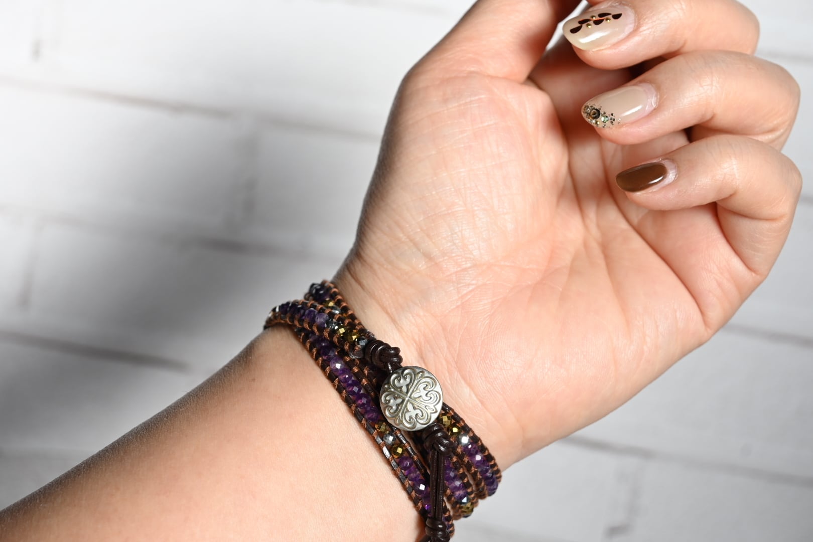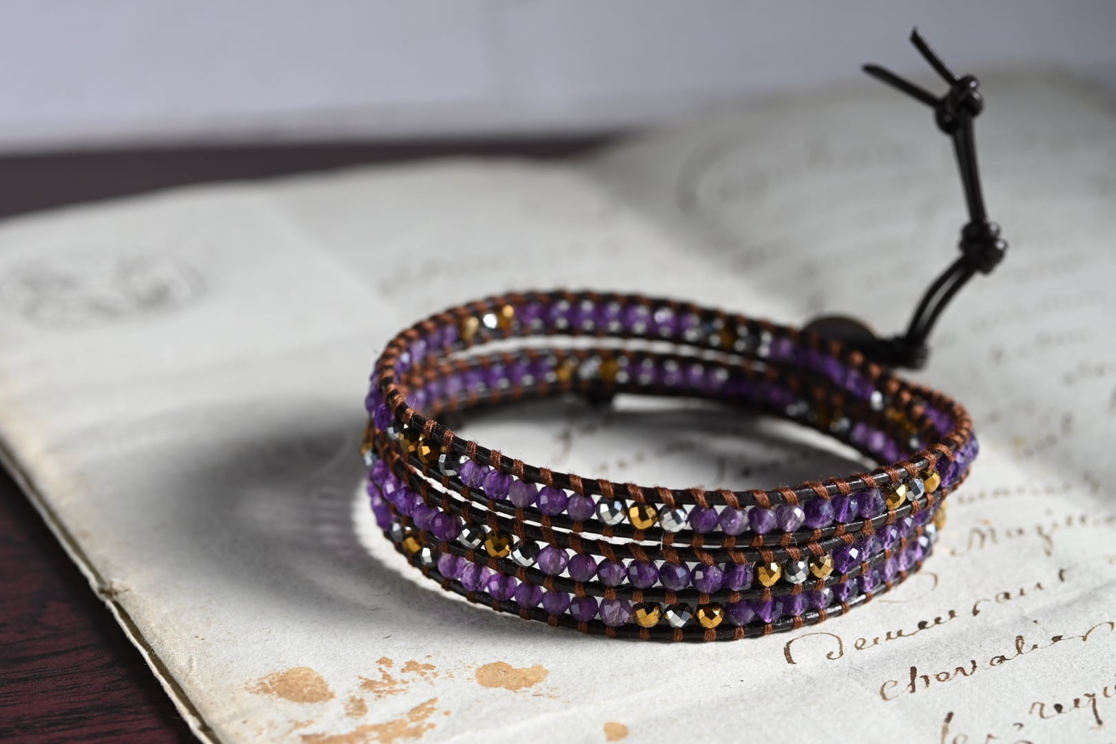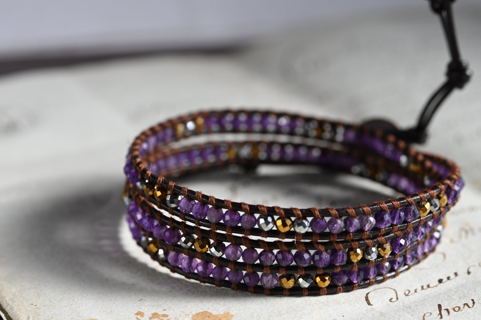 透明感あふれるアメジストを贅沢に繋げた、3連仕立てのラップブレスレットです。 一連ずつ表情の異なる石たちが重なり合い、手元に華やかなボリュームと気品を与えてくれます。