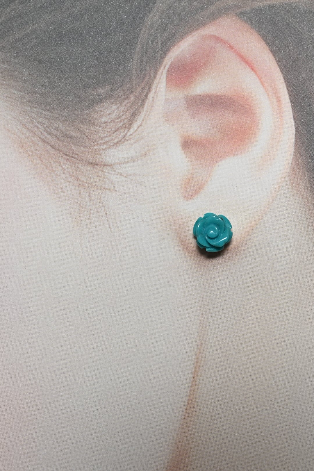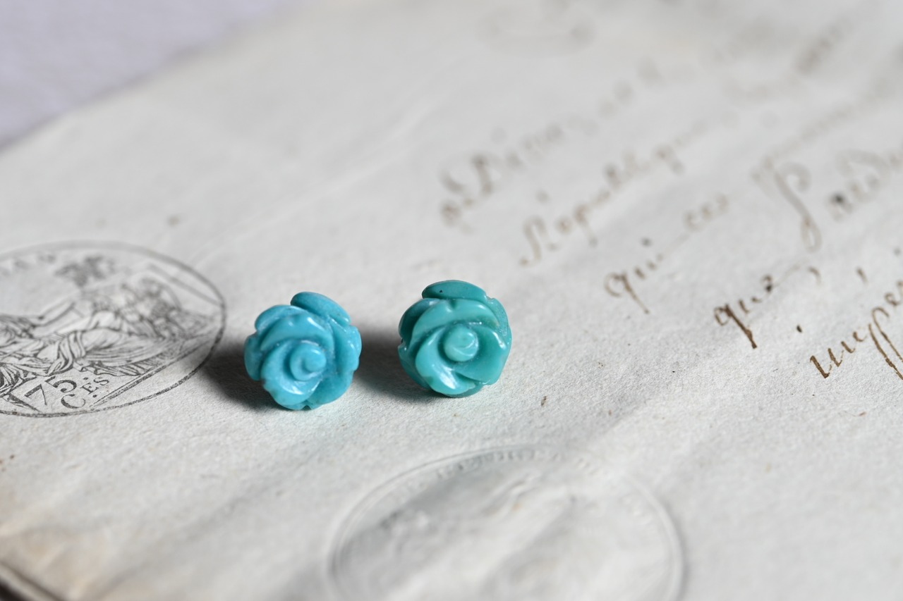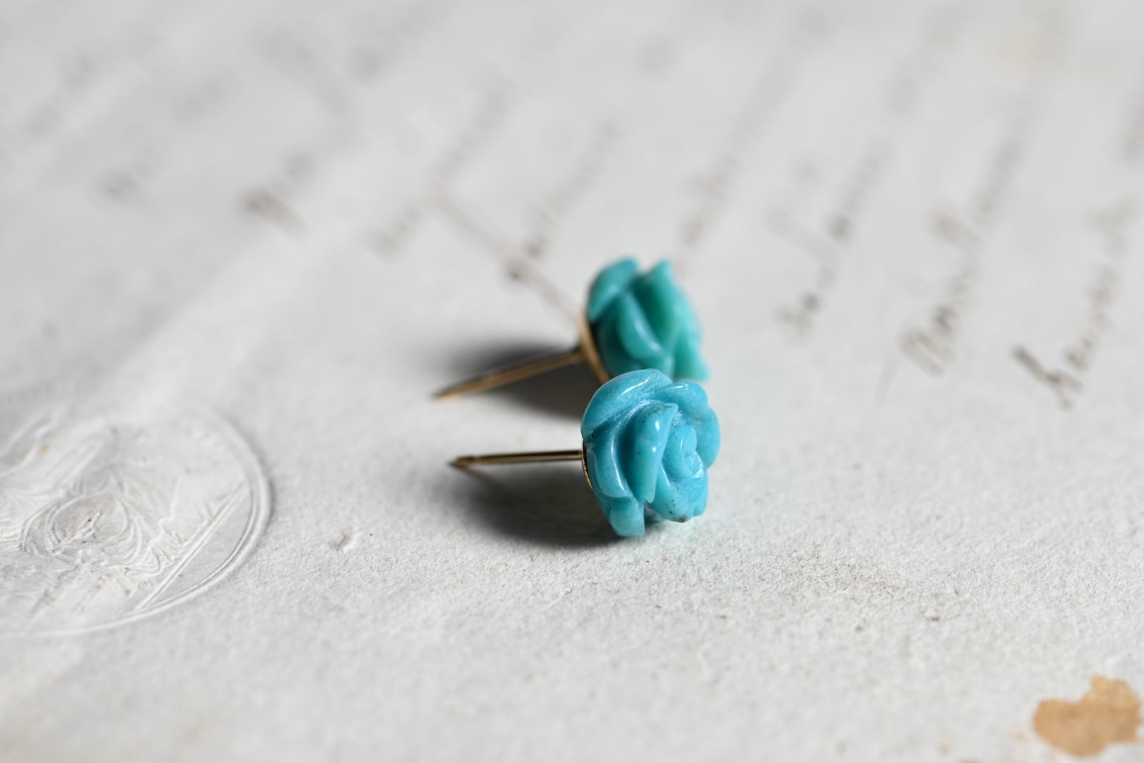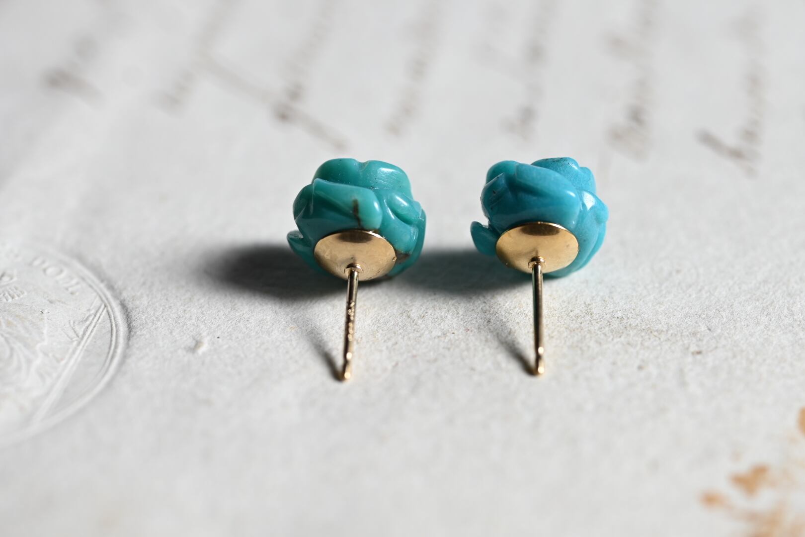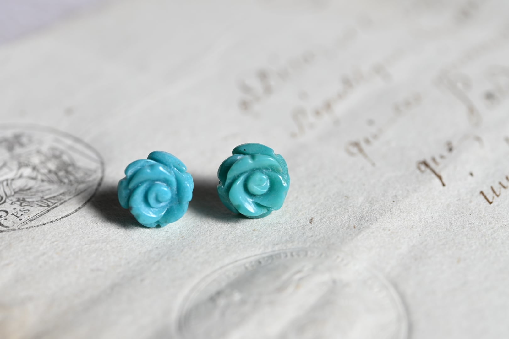 天然ターコイズを贅沢に薔薇の形に彫り上げた、スタッドピアスです。