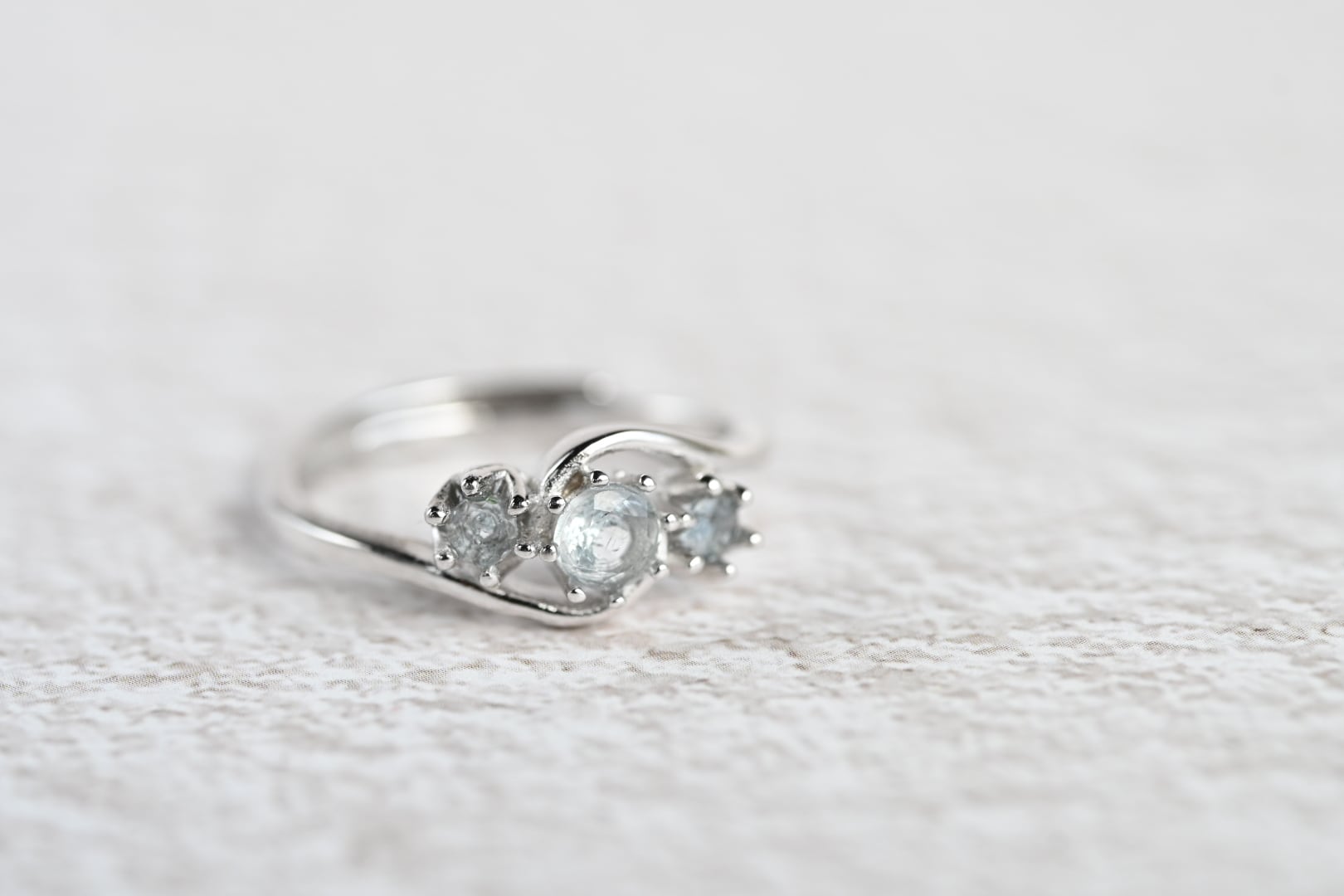 指元で描き出すのは、浅瀬から深海へと移り変わる美しい海のグラデーション。3石が放つ多角的な輝きは、1石のリングとはまた違う圧倒的な存在感とリズムを生み出します。