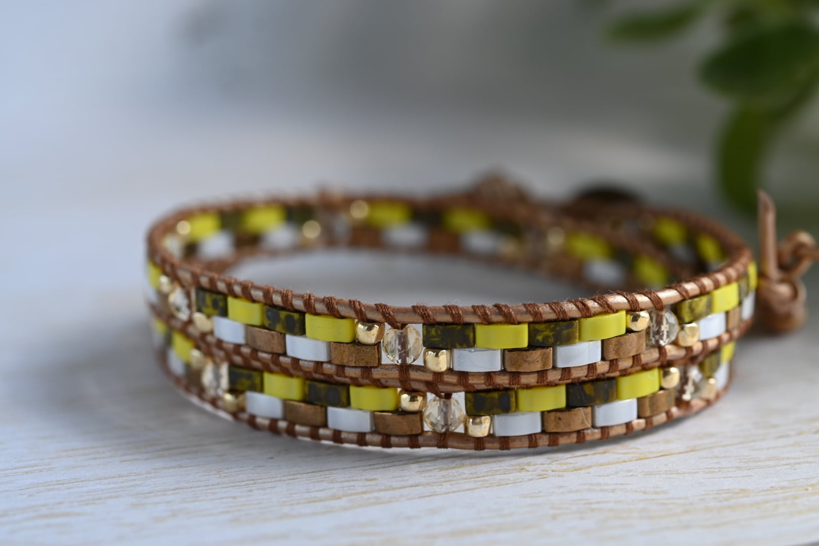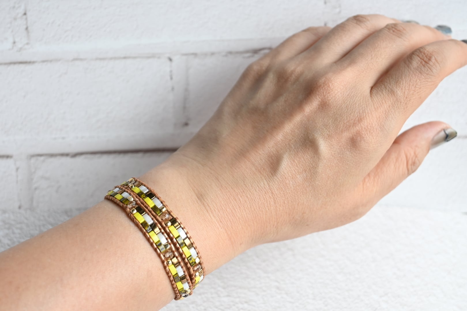 イエローの輝きが魅力のシトリンを、HALF TILAビーズと合わせたラップブレスレット。