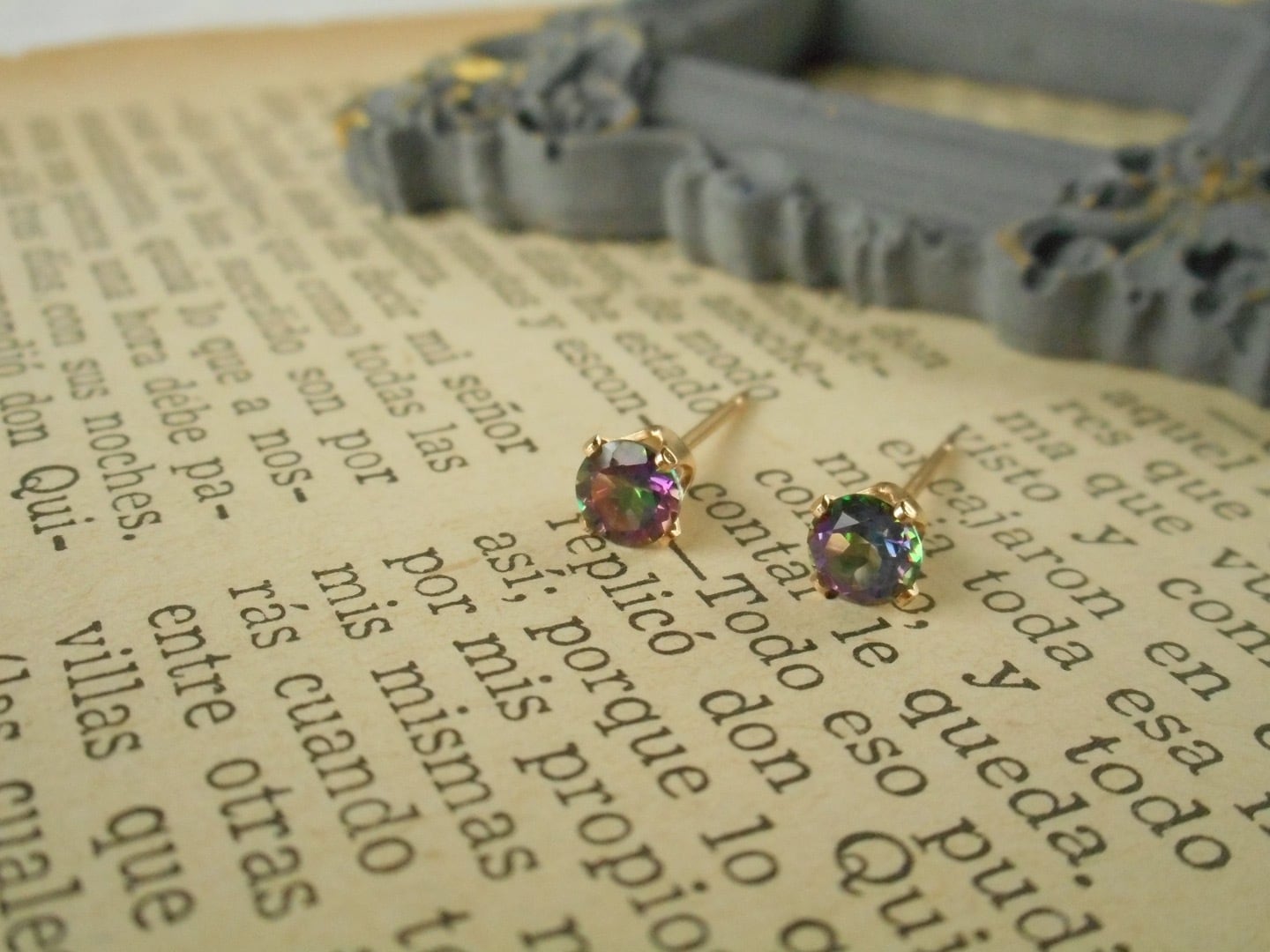 ミスティックトパーズの色味は「ミスティック」の名にふさわしく、ブルーやグリーン、イエロー、パープル、ピンクといったさまざまなカラーが1つの石の中に複雑にきらめく、万華鏡のような色合いです。光の当たり方や見る角度によって色の見え方が変わることを遊色効果と言いますが、その様はさながら北欧の夜空に揺らめくオーロラのようであるとも表現されます。
