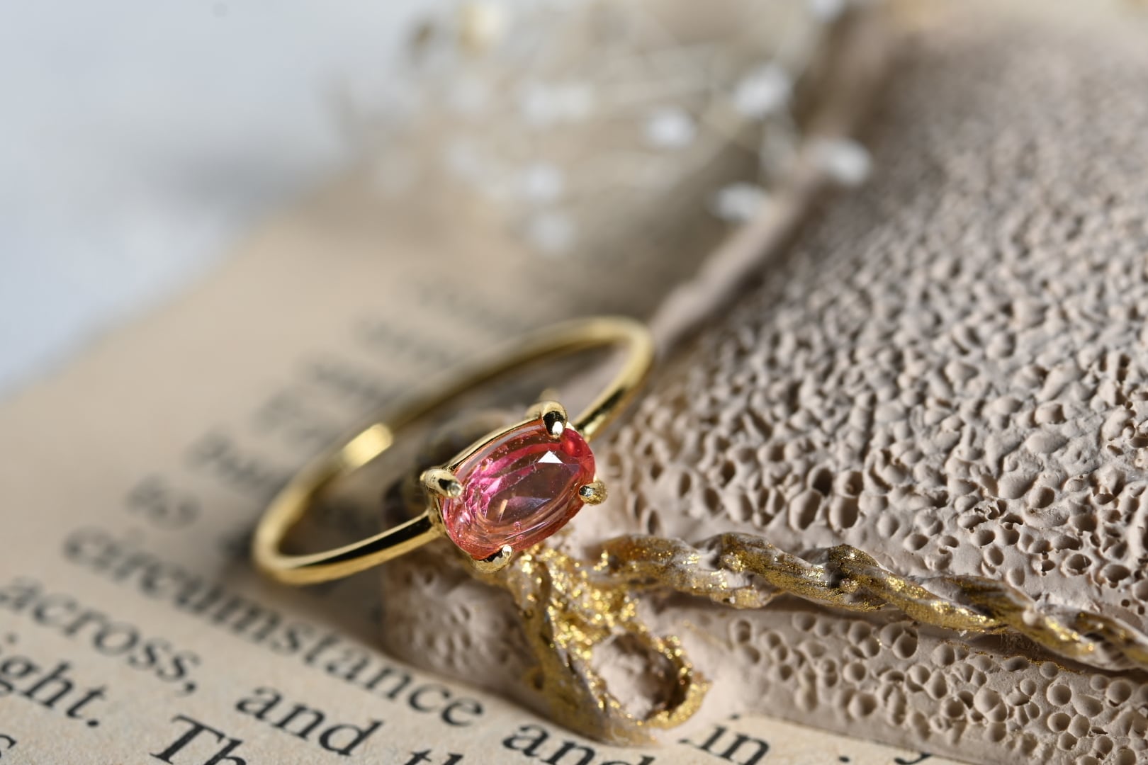 ピンクトパーズ オーバルファセット プチリングは、上品さと華やかさを兼ね備えたアクセサリーです。透明感のあるピンクのストーンが指先を飾り、女性らしい印象を与えてくれます。