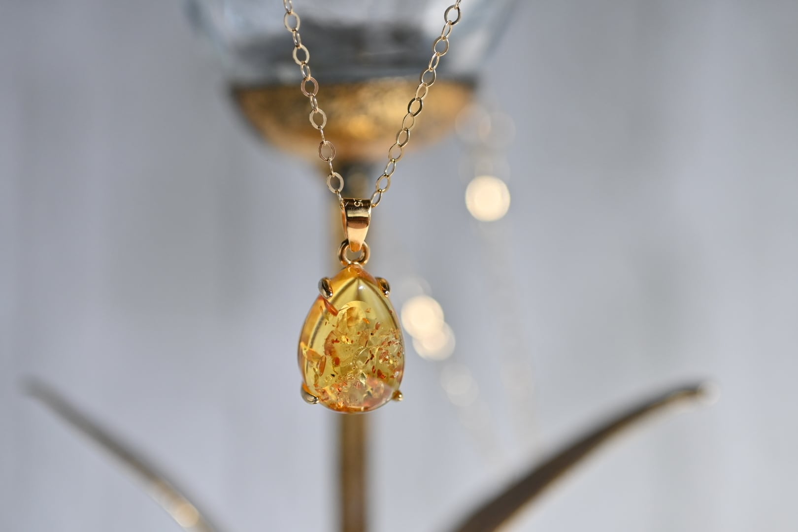 まるで人魚の涙が輝くような透明感。琥珀が持つ内包物(インクルージョン)が光の当たり方で美しい輝きを放ちます。