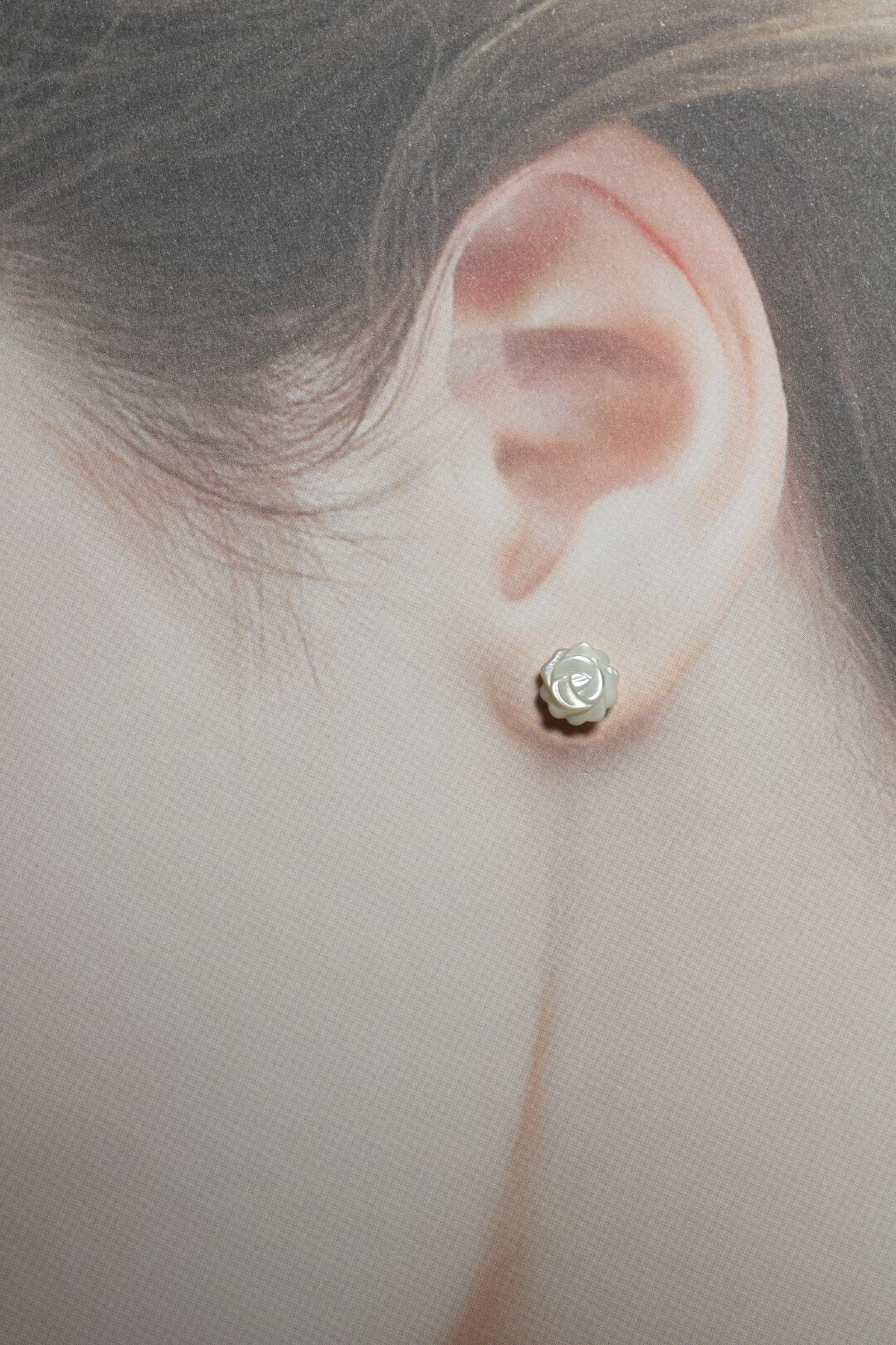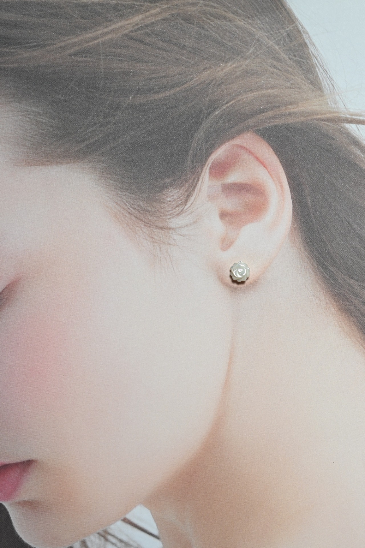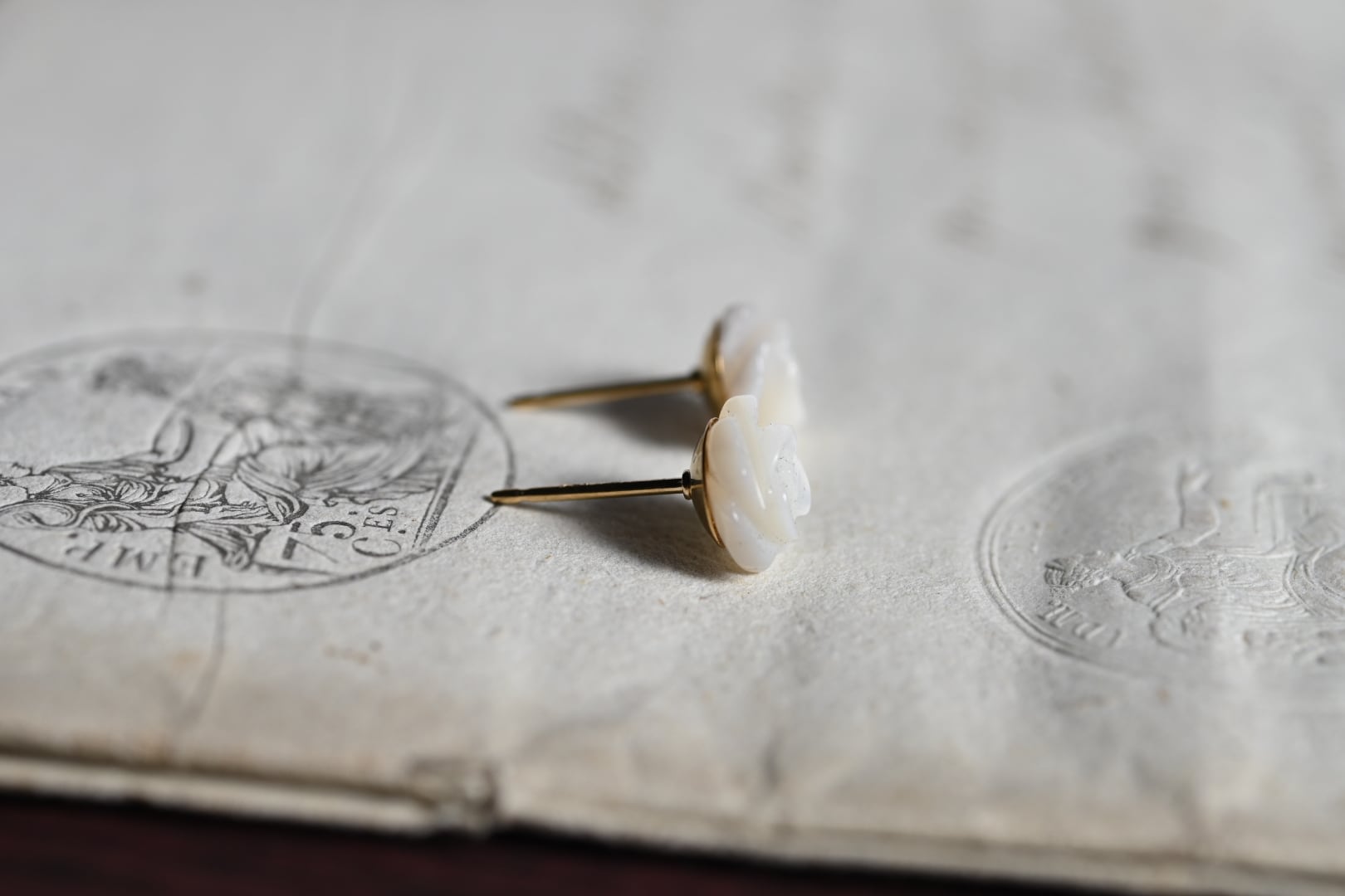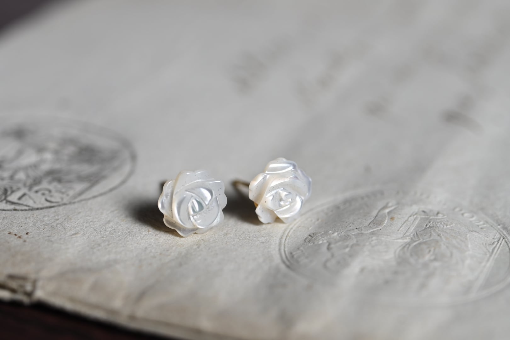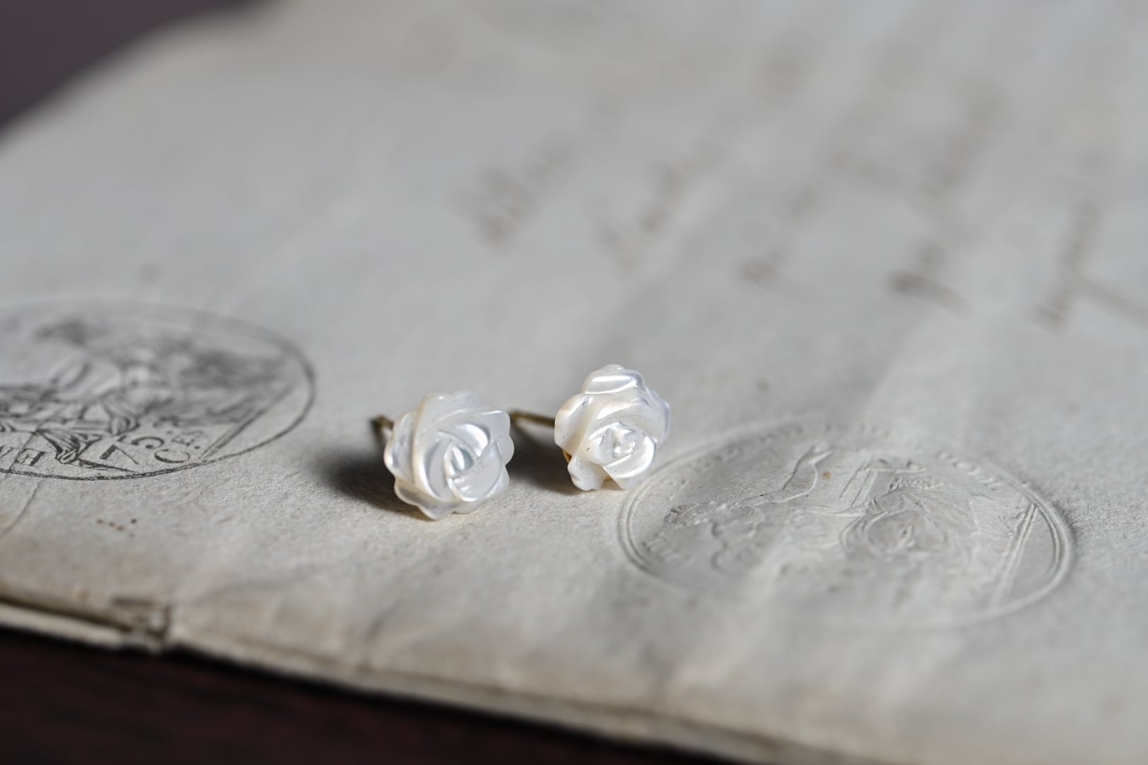 真珠を育む母貝である「白蝶貝(マザーオブパール)」を、可憐な薔薇の形に彫り上げたピアスです。